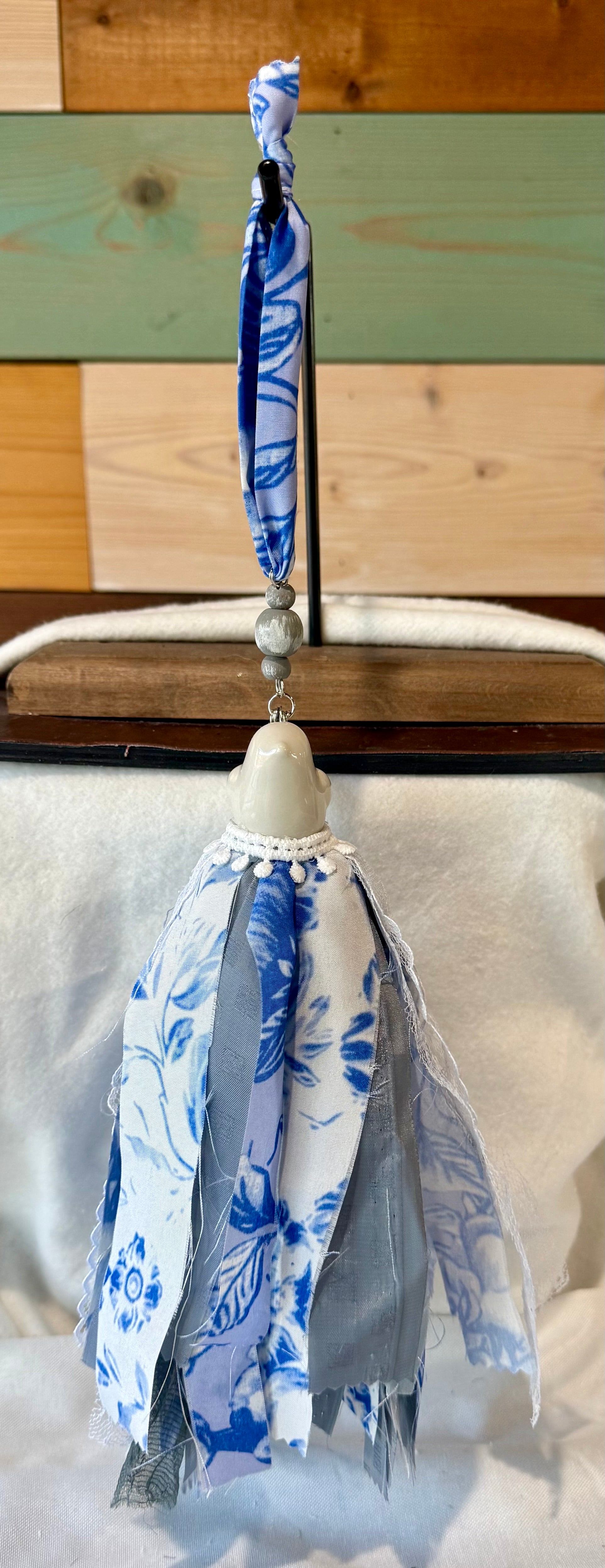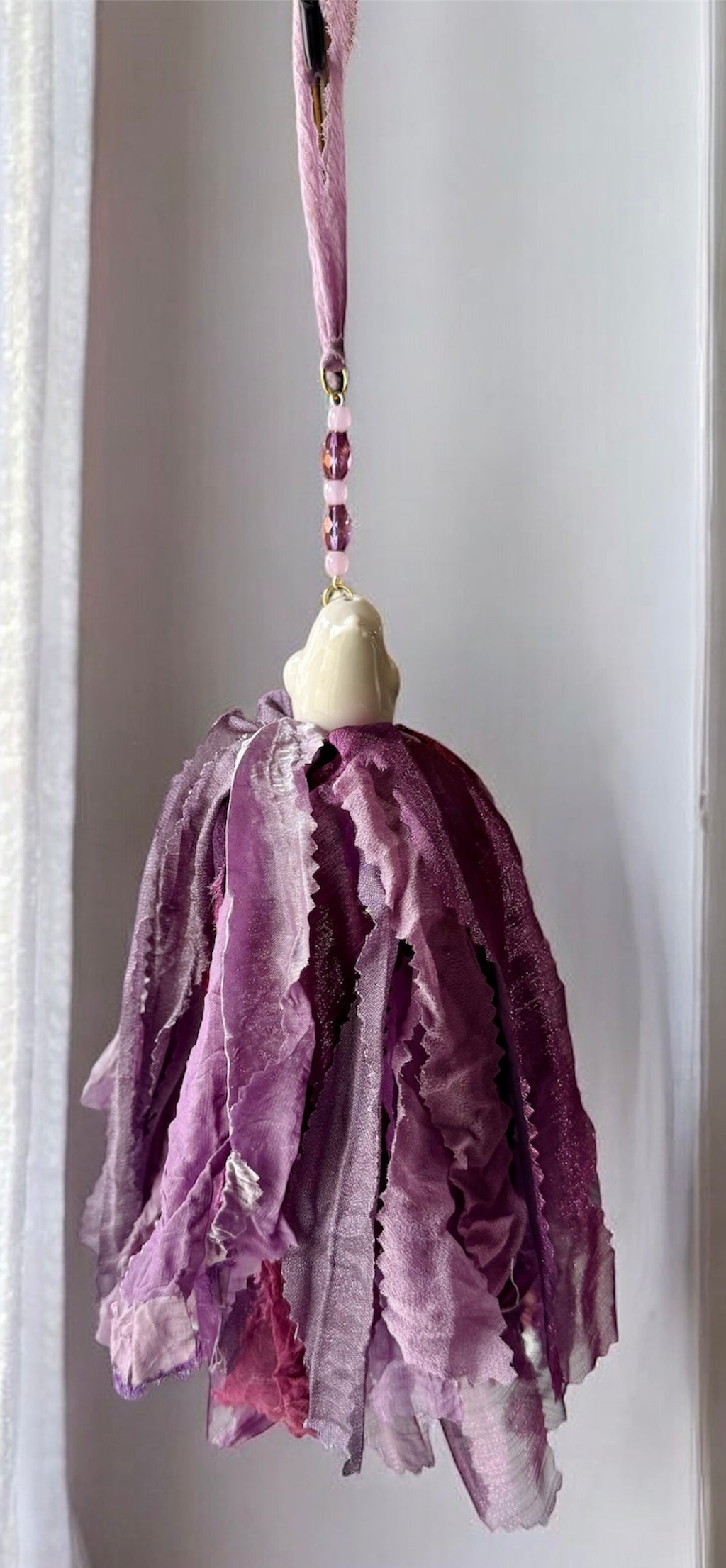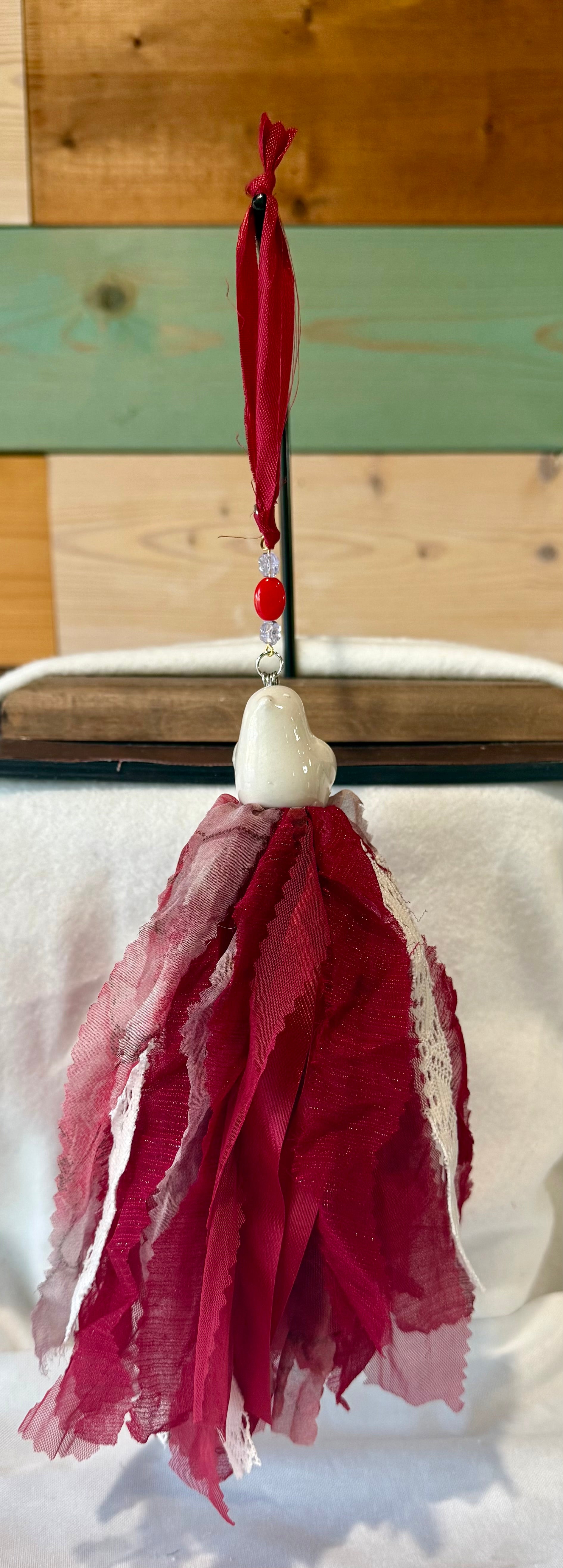The tassel length varies (fabric & shaker) and is approximately 7 to 9 inches, the hanger length (beads & ribbon hanger) adds approximately 5 to 8 inches to the overall length.