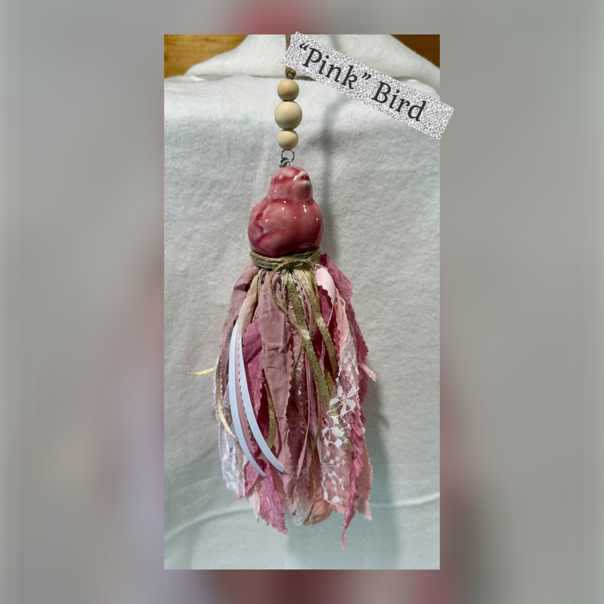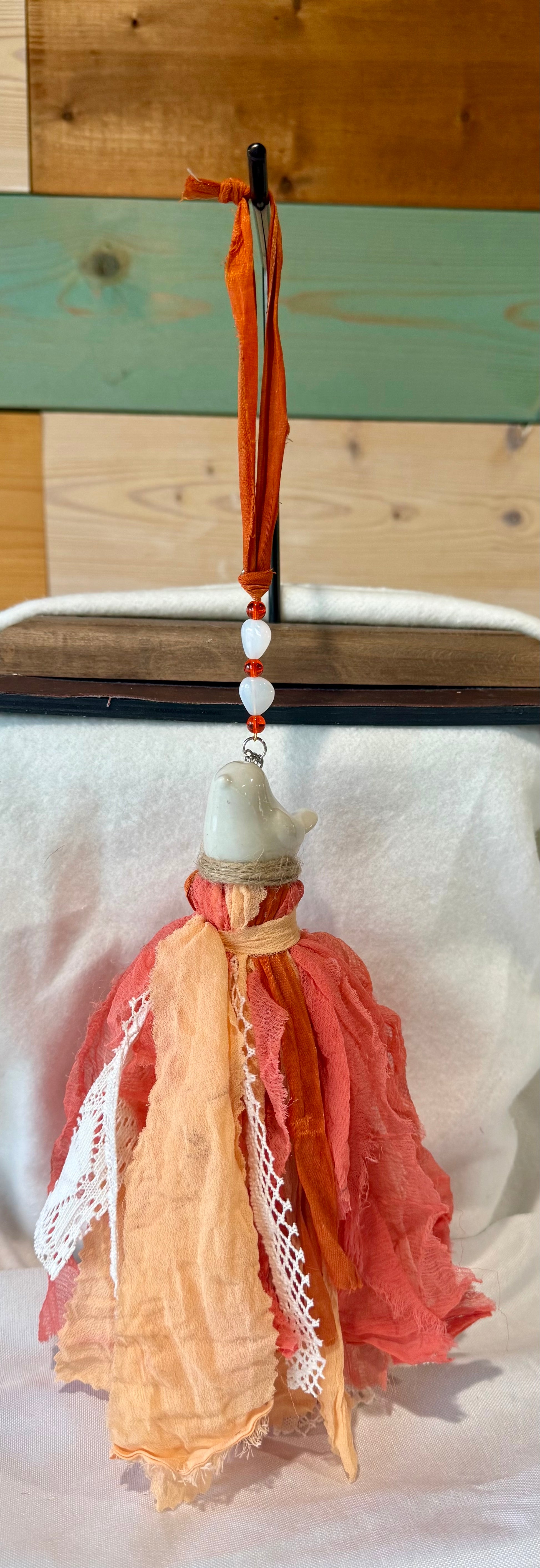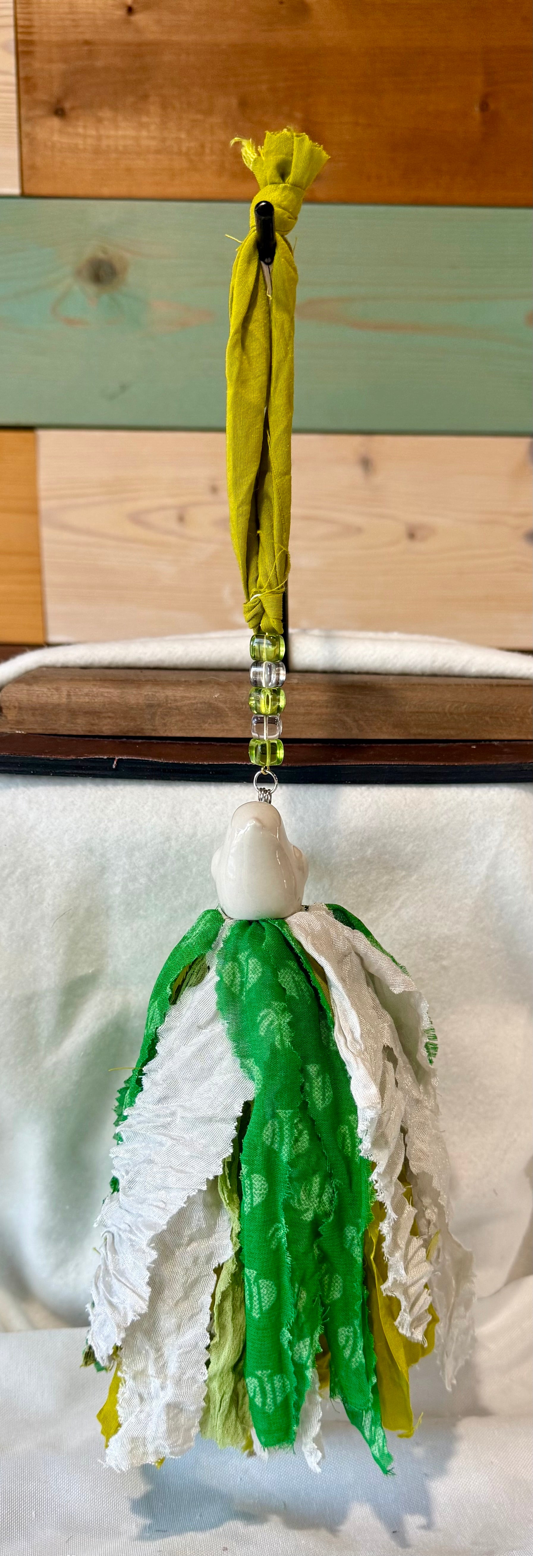 The tassel length varies (fabric & shaker) and is approximately 7 to 9 inches, the hanger length (beads & ribbon hanger) adds approximately 5 to 8 inches to the overall length.