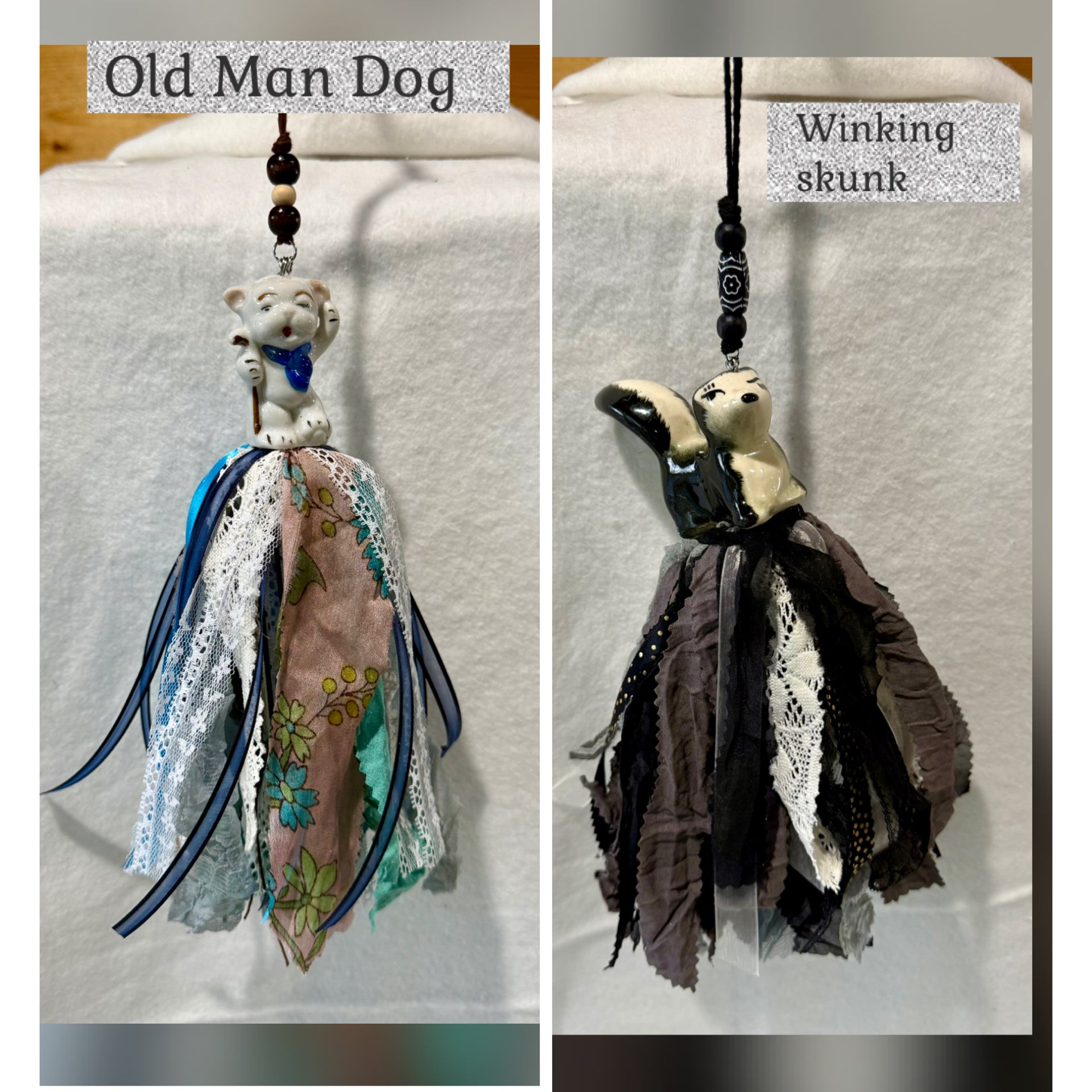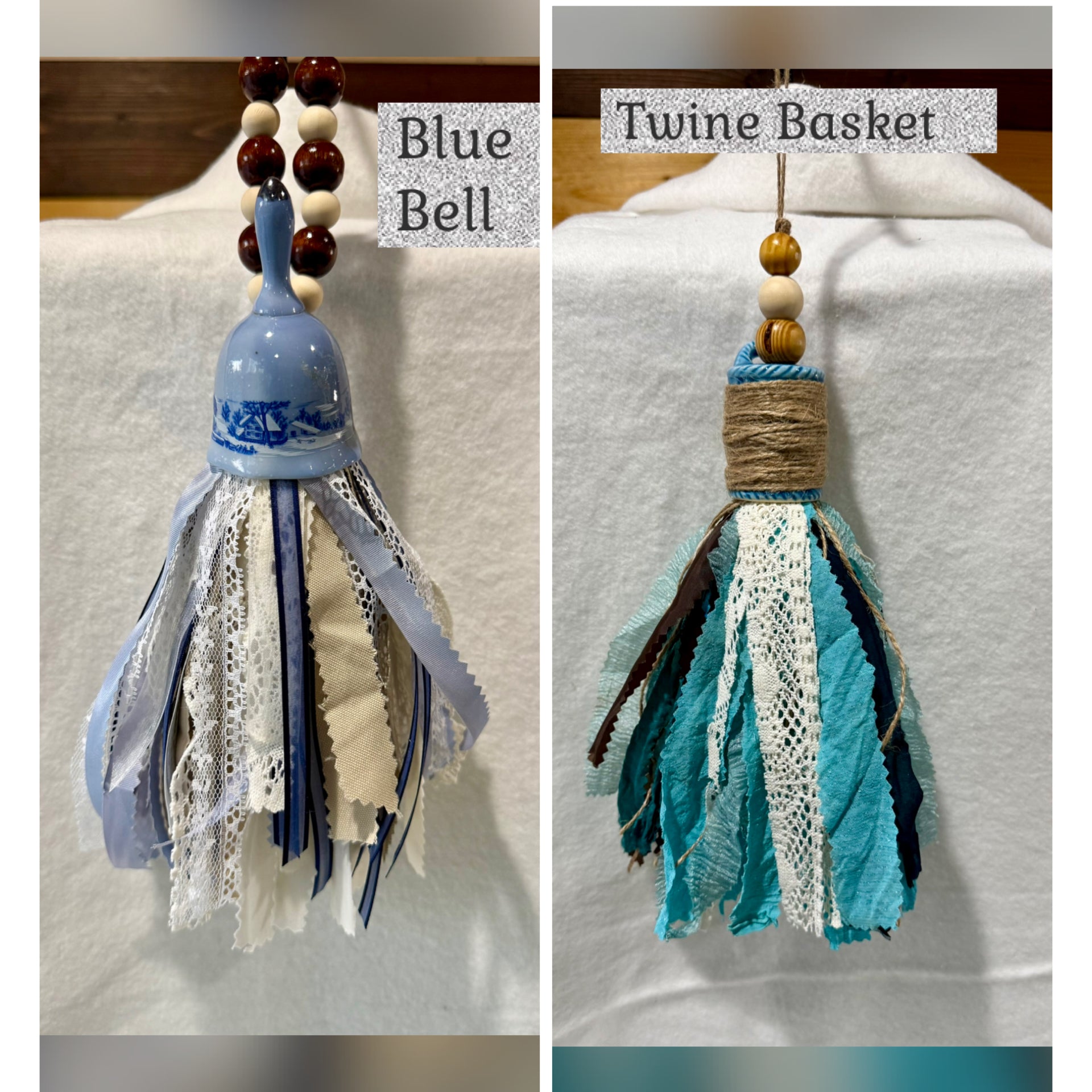 Discover the charm of these Shabby, Boho tassels, each handmade with love and creativity. These unique tassels feature a variety of vintage or new salt/pepper shakers, toothpick holders or bells, adding a whimsical touch to your home decor. The tassel part is made from repurposed materials like leftover project scraps and thrifted clothing fabric, each piece is one-of-a-kind. Hang them anywhere you desire—be it your kitchen window, on a door, or even a cabinet knob—to add a touch of rustic elegance.